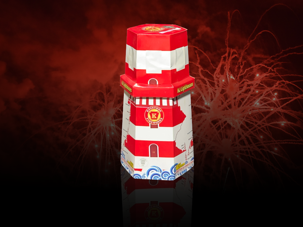 A colorful lighthouse with assorted effects of silver, gold, and crackles. The lighthouse finishes with strobes that light up the sky!